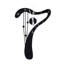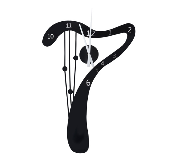 Hodiny ve tvaru harfy k vlastní montáži. Může být módním doplňkem každého bytu a kanceláře. Velikost hodin je 70 x 50 cm. <Dane techniczne: ddługość wskazówki minutowej 31,5cm długość wskazówki godzinowej 23,5cm średnica tarczy zegara: ok 10cm zasilanie: bateria 1 x AA (brak w zestawie) kolor: czarny waga: 360g