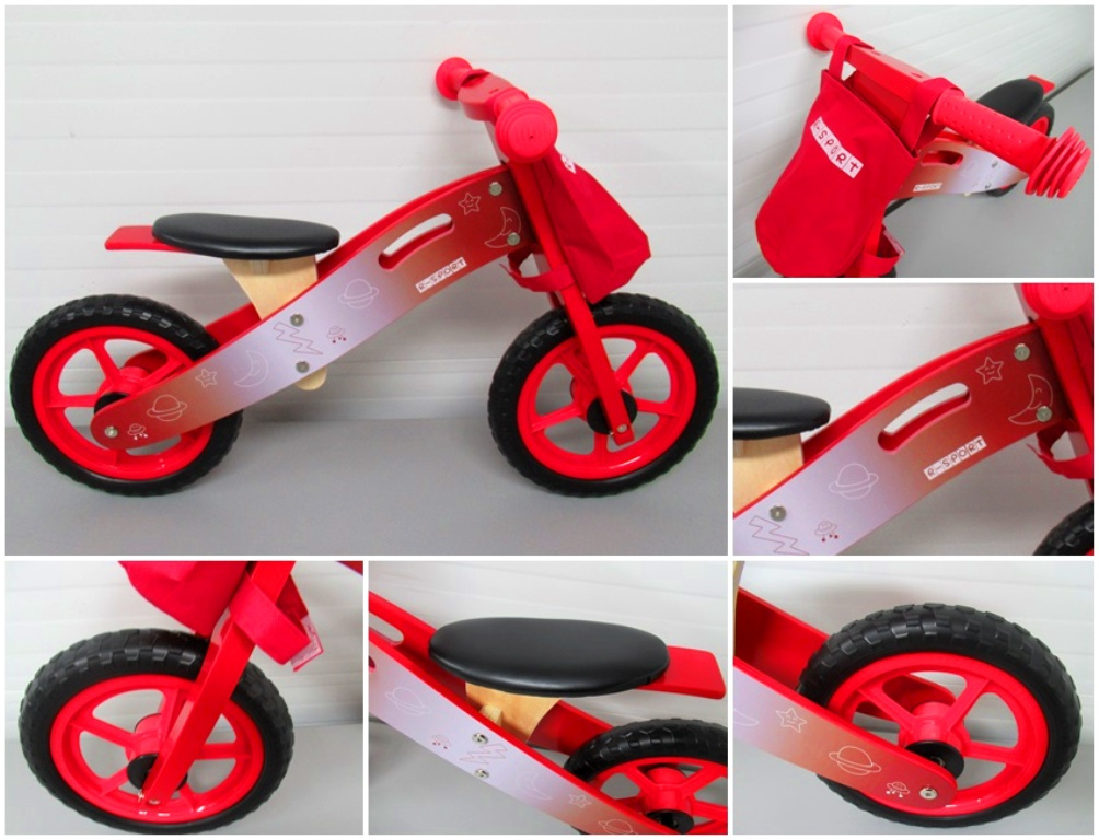 Odrážedlo je vybaveno bezpečnými protiskluzovými gripy řídítek, měkkým výškově nastavitelným sedátkem a komfortními koly z tvrzené pěny s ložisky o průměru 12".