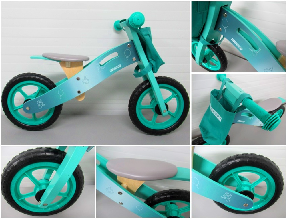 Odrážedlo je vybaveno bezpečnými protiskluzovými gripy řídítek, měkkým výškově nastavitelným sedátkem a komfortními koly z tvrzené pěny s ložisky o průměru 12".