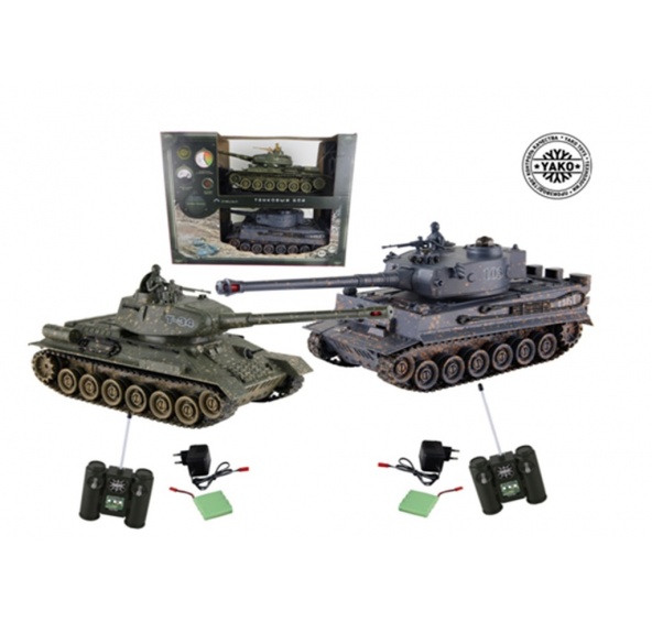 1:24 RC TANK T34 vs TIGER (sada 2ks) Balení obsahuje 2× tank na R/C dálkové ovládání ovládané radiovým signálem.Dosah ovladače 25 – 50m podle nastavené frekvence,dosah infračerveného světla až 8m Funkce : jízda všemi směry,stoupání 45°,zpětný chod,otočná věž 330° s dělěm,zvukové a světelné efekty Výrobek na baterie : 4×AA 1,5V pro každý tank 2× AA 1,5V pro každý ovladač Věk 6+