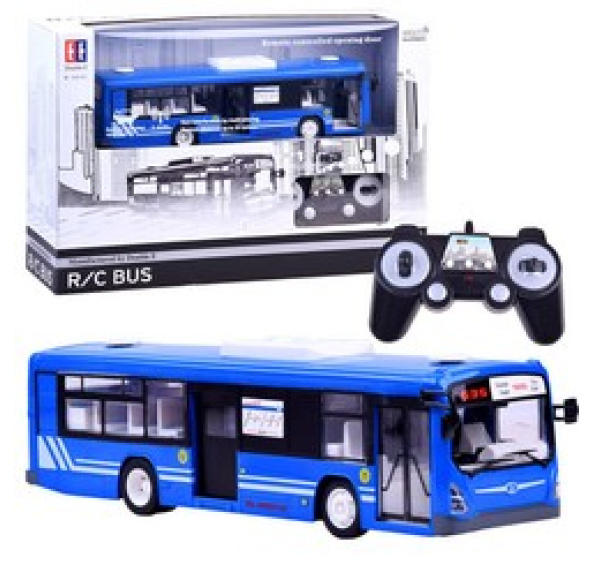 Hračkový autobus s otevíracími dveřmi. Dálkově ovládané vozidlo.