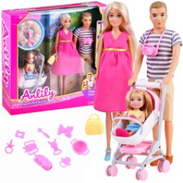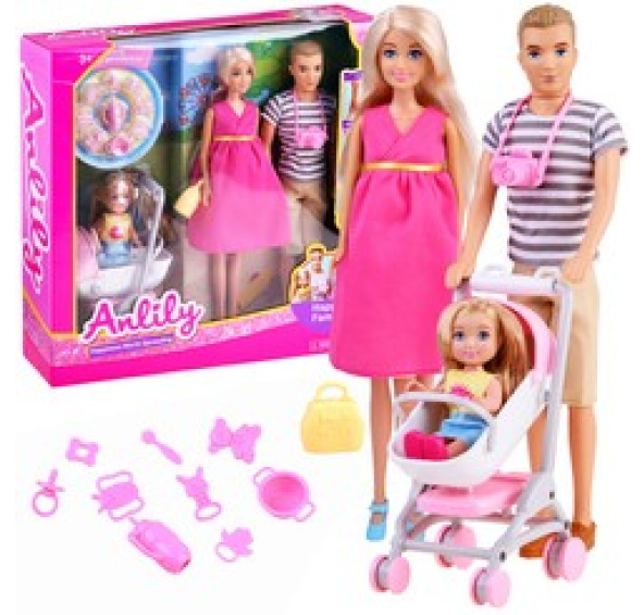Těhotná maminka (miminko lze vyjmout a vrátit zpět do bříška panenky) oblečená v okouzlujících šatech, které neomezují v pohybu. Modré boty na podpatku. Táta, oblečený v krátkých šortkách a elegantním tričku, je připraven kdykoli vyfotit své blízké. Malá holčička s blonďatými copánky v růžových šatech vesele následuje své rodiče. Panenky mají pohyblivé ruce a nohy.