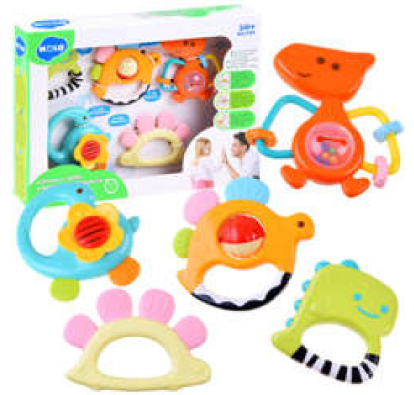 Sada obsahuje 5 různých chrastítek zabalených v barevném, pěkném a originálním balení.