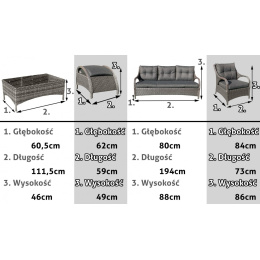 Konstrukce všech prvků soupravy byla usazena na HLINÍKOVÉM rámu, který zajišťuje, že souprava je lehká a odolná vůči povětrnostním vlivům.Díky použití vysoce kvalitního hliníku je sada zcela odolná proti korozi. Rám nábytku je potažen silnými technorattanovými pásy, které jsou příjemné na dotek. Praktický stůl je vybaven deskou z tvrzeného bezpečnostního skla o tloušťce 5 mm. Sada obsahuje 9 měkkých polštářů + obrovský sedací polštář z bavlny, které se velmi snadno udržují v čistotě. Potahy sedadel mají zipy, takže je můžeme sundat a vyprat. Vložka polštáře je vyrobena z odolné čalounické pěny o tloušťce cca. 11 cm. Polštáře na opěradlech mají výrazné prošívání.