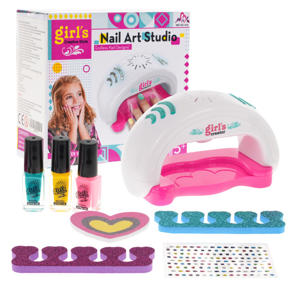 Bezpečná interaktivní sada pro malé manikérky od pěti let. Sada obsahuje vše potřebné pro manikúru. Vysoušeč nehtů skutečně vysušuje nehty a vydává zvuky při sušení, jeho horní část je osvětlena světly, napájení - 2 x AAA 1,5 V (není součástí balení). Lak na nehty je bezpečný a netoxický a po skončení hraní se velmi snadno odstraňuje.
