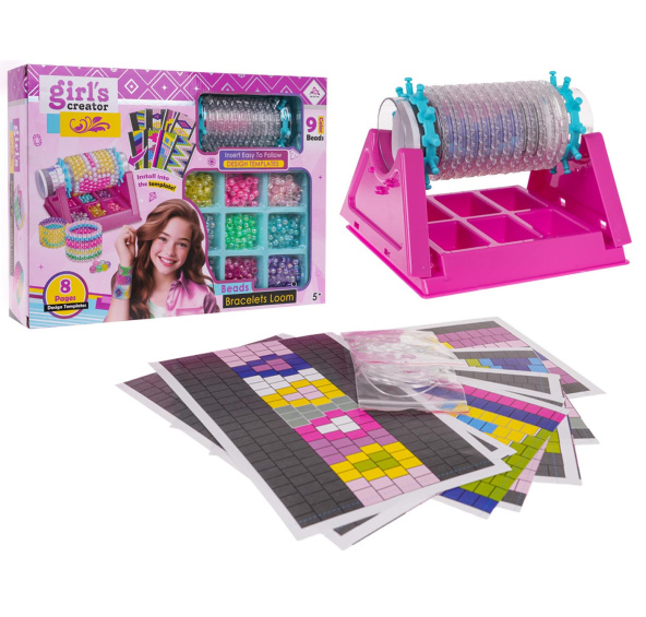 Sada na výrobu náramků s tkalcovským stavem a doplňky pro děti od 5 let. V sadě se nachází tkalcovský stav, 8 šablon a 540 korálků v 9 barvách. Použití stavu na náramky je jednoduché, stačí nasadit plastovou trubku na stojánek. Do přihrádky nasypat korálky, každý barevný do samostatné přihrádky, aby to bylo jednodušší. Vybereme si ze vzorníku vzor, který chceme vytvořit, nebo vyrobíme náramek podle vlastního nápadu. Umisťujeme korálky na trubičku a začínáme tkát, začínáme z pravé strany a posouváme se doleva. Nitku provlékáme střídavě nahoru, dolů. Opakujeme činnosti na všech řadách korálků. Po dokončení tkaní opatrně sundáme náramek z tuby. Sada rozvíjí manuální dovednosti a kreativitu.
