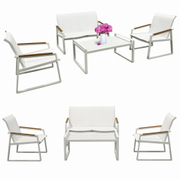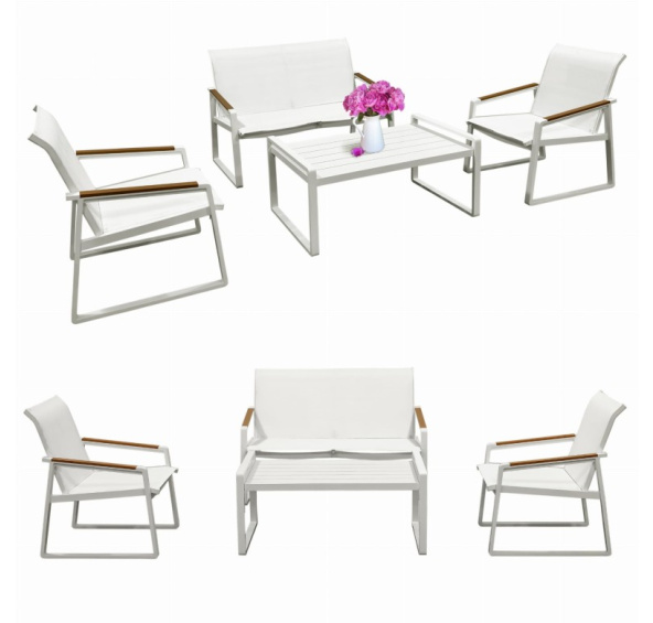 Odolnost vůči povětrnostním podmínkám: Rám z práškově lakovaného hliníku a deska z polywoodu zajišťují odolnost proti dešti, slunci a vlhkosti – bez nutnosti schovávat nábytek při každé změně počasí. Lehká a stabilní konstrukce: Hliník je nejen odolný, ale také lehký – nábytek lze snadno přemístit, a zároveň je stabilní a bezpečný při používání. Snadné čištění a údržba: Povrchy vyrobené z polywoodu a hliníku stačí otřít vlhkým hadříkem – žádné problémy s impregnací nebo speciální péčí. Sada pro 4 osoby - ideální uspořádání: dvě pohodlné židle, dvoumístná pohovka a prostorný stolek – ideální pro rodinnou snídani nebo večerní setkání s přáteli.