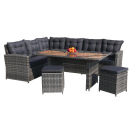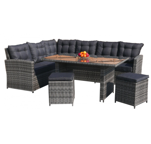 Popis produktu Sada zahradního nábytku 4v1 Techorattan Grey + rohová jednotka + stůl + 2 pufy + 15 polštářů