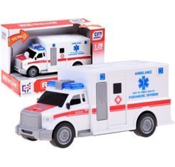 Sanitní vůz je celý z plastu a má zvukové a světelné efekty. Bílá barva s červenými a modrými prvky zajišťuje viditelnost vozidla během záchranné operace.