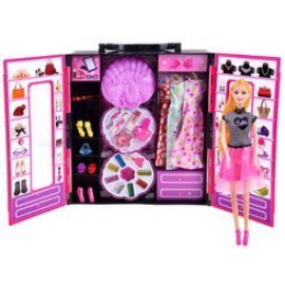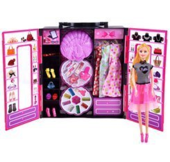 Šatní skříň pro panenky je určena pro dívky, které vědí, že všechny panenky potřebují prostornou skříň, do které mohou uložit své krásné šaty a další doplňky. Šatní skříň v růžové a černé barvě má dvoukřídlé průhledné dveře, které se zavírají pomocí háčku a úchytky, takže si přenosnou skříň můžete vzít kamkoli s sebou. Skříň je rozdělena do tří oddílů, v prvním jsou police na doplňky, ve druhém je místo na ramínka a třetí lze využít jako místo pro uložení panenky po hraní nebo při cestování. Skříň je vybavena různými doplňky: šaty, botami, kabelkou, hřebenem, sponkami, sadou líčidel umístěnou v uzavíratelné krabici a panenkou.Šatník s mnoha doplňky dívky jistě zabaví na dlouhé hodiny. Doplňky a oblečení uvnitř budou při hře velmi rozmanité, panenku lze stylizovat mnoha různými způsoby Jednoduše vkročte přímo do světa módy!