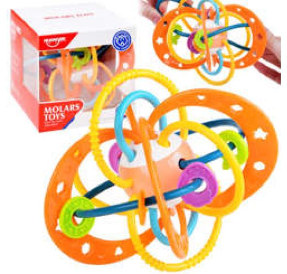 Díky ohebným prvkům bude moci dítě hračku bez problémů držet v rukou. Hladký a měkký povrch pružných válců skvěle masíruje dásně vašeho dítěte. Barevné dílky umístěné na pružných vírech snadno kloužou po hračce.