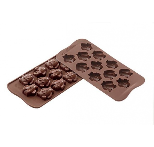 Popis produktu Silikonová forma na čokoládu – velikonoční zvířátka - Silikomart - SilikomartS touto silikonovou formu si snadno doma připravíte krásné velikonoční cukroví. Na formě jsou čtyři různé vzory: pes a fenka s mašlí, kuře a kuřecí slečna.
