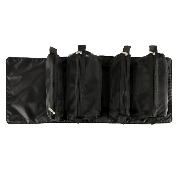Černá cestovní kosmetická taška - lze srolovat, aby v zavazadle zabírala méně místa. Má čtyři přihrádky, které lze vyjmout. Stěny přihrádek jsou vyrobeny ze síťoviny, která usnadňuje hledání výrobků a také zajišťuje dobré odvětrávání mokrých obalů.