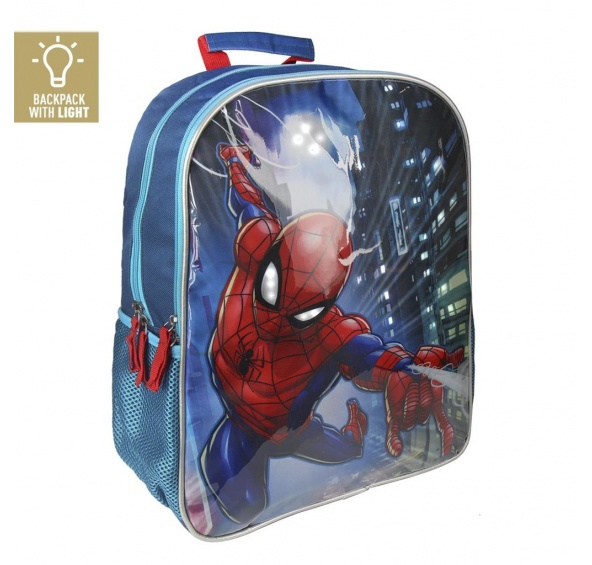 Školní batoh Spiderman svítící. Dvou­komorový školní batoh s pevnými polstrovaný zády, praktickým uchem na nošení v ruce, přední kapsou a nastavitelnými a polstorovanými popruhy, s dvěma zipy a bočními kapsami na pití. Rozmět batohu 31×41×13 cm.