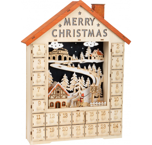 Vánoce jsou za dveřmi! S tímto dřevěným adventním kalendářem s mnoha detaily se nastěhuje duch vánoc i k Vám. Okýnka kalendáře můžete naplnit dobrůtkami nebo dárečky. Adventní kalendář má jemné osvětlení, po setmění jej tak můžete použit jako lampu. LED světla jsou napájeny dvěma AA bateriemi, můžete je kdykoliv vypnout a zapnout pomocí malého vypínače. Hlavní vlastnosti: LED osvětlení (2×AA baterie nejsou součástí balení)dekorativní kalendář můžete používat znovu a znovu každý rokdrobné, jemně vyřezávané detaily