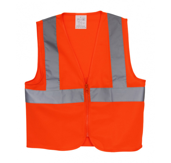 Malá oranžová dětská bezpečnostní vesta se zapínáním na zip a třemi reflexními pruhy, splňuje základní bezpečnostní standardy. Hlavní vlastnosti: bezpečnostní vesty jsou dnes v rámci bezpečnosti předepsanés reflexními pruhy