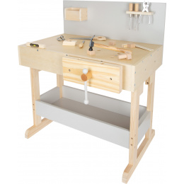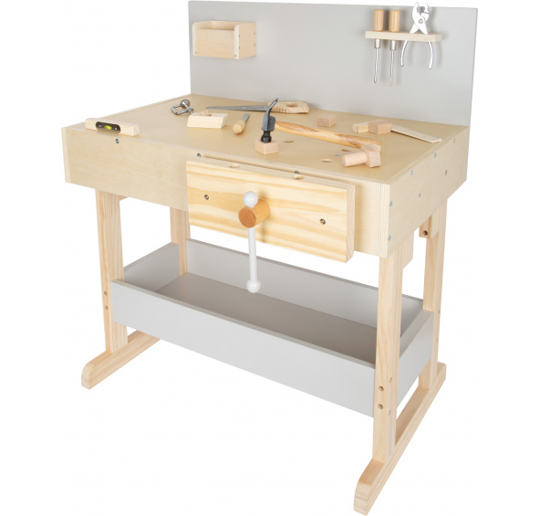 Robustní dětský pracovní stůl, který je dobře vybaven. Deset dětských nástrojů můžete uložit do několika míst, jsou zároveň vždy po ruce. Je vyroben z mixu přírodního a šedého dřeva, což je opravdu pěkná kombinace. Díky jednoduchému designu se hodí do každého interiéru. Pracovní stůl je vybaven pilou, kladivem, kleštěmi, svěrákem, tesařským úhloměrem, vodováhou, dlátem, hoblíkem, 2 šroubováky a 4 šrouby. Hlavní vlasnosti 14 ks nářádíMnoho úložného prostoruVyrobeno ze dřeva