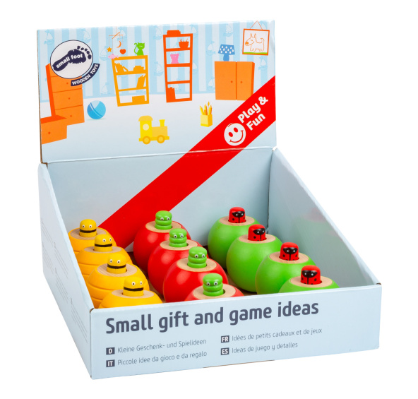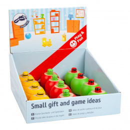 Roztočte to s rozpustilými červíky! Malí, vykukující drzouni po stisknutí vždy legračně zapískají. Hračka je vyrobena ze dřeva, které je příjemné na dotek, spolu s oblými tvary stimuluje hmat a pomáhá rozvíjet motorické dovednosti. Je detailně dekorována pestrými barvami, kterými snadno upoutá pozornost. Lze vybírat ze třech různých provedení. Hlavní vlastnosti:12 ks v displeji, 3 různé barevné variantymotorická a zvuková atrakcerobustní a odolné dřevěné provedení
