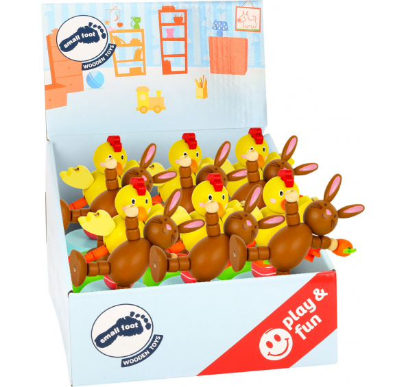 Small Foot Displej Mačkací velikonoční figurky 12 ks Sada 12 ks. Zábava začíná stisknutím tlačítka. Roztomilá kuřata a zajíčci jen čekají až stisknete tlačítko v jejich podstavci. Začnou se totiž hýbat, tančit. Krásná barevná hračka vyrobená ze dřeva. Německá firma Legler zaměřená na výrobu kvalitních dřevěných hraček od roku 1996. Všechny dřevěné hračky značky small foot mají označení CE a jsou vyráběny dle evropské normy pro bezpečnost hraček EN 71. Použité barvy jsou speciálně vyvinuty pro dřevěné hračky a jsou odolné i proti slinám dětí. Dřevo, které se používá pro tyto hračky, většinou pochází z lesnických společností zapojených do zalesňování. To nabízí všem zákazníkům možnost přispět k zachování přirozeně rostoucích lesů. Dřevěné hračky small foot jsou zářivě barevné produkty, které jsou vyrobeny převážně z přírodních surovin - dřeva. Dětem dělají radost od útlého věku, rozvíjí jejich hmatové a smyslové dovednosti. Cílem značky small foot je podporovat duševní a fyzický vývoj dětí.