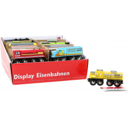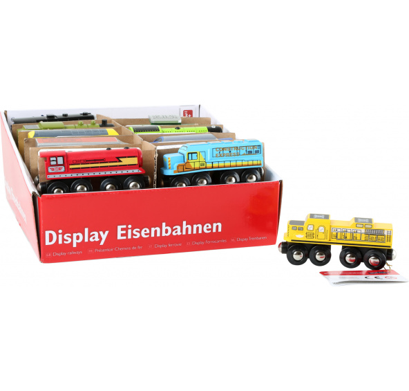 Hu-hů! Tento displej obsahuje 24 kusů vláčků s magnety. Jsou z dřevěného masivu, různě barevně lakované, v balení najdete mašinky i vagóny. Spojujte je magnety, jak je libo. Kompatibilní s produkty dalších výrobců vláčkodráh. Hlavní vlastnosti: obsahuje mašinky i vagóny různě barevně lakovanékompatibilní s dřevěnými vláčkodráhami jiných výrobcůpodporuje představivost, obratnost a koordinaci