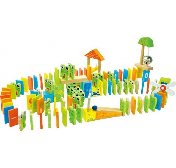 Sestavením barevných dřevěných dílů a malých žábiček lze vytvořit dráhu. Když poslední blok dřeva zasáhne zvonek, hra je u konce. Na dílcích jsou natištěna čísla a písmena, takže se děti učí číslům a abecedě. Hlavní vlastnosti: obsahuje 100 ks dílůpestrobarevné provedenírozvíjí logické myšlení, zručnost a trpělivost