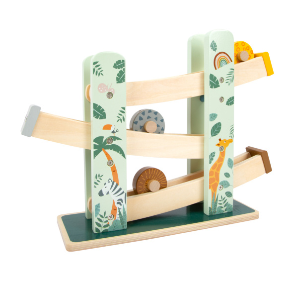 Kutálejí se přírodou, nabírají rychlost. Tři dřevěná kolečka s rozdílnou ilustrací a vzory se kutálí dolů po třech rampách. Dráha je dekorována ilustracemi safari zvířat a rostlin z džungle. Krásná hračka, která slibuje dlouhotrvající zábavu. Hlavní vlastnosti: pastelové barvydráha a 3 kotouče