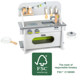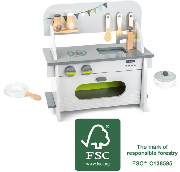 Poškozený obal. Nové zboží bez závad. Vaření může začít! Tato kompletně vybavená kuchyňka vyrobená z FSC® 100% certifikovaného dřeva má vše, co mladí kuchaři potřebují pro přípravu hostiny. Trouba je vybavena vhodnými otvíracími dvířky. Na sporáku se nachází hrnec s odnímatelnou pokličkou. Solnička a pepřenka poskytují potřebné koření. Tuto kuchyň lze sestavit a rozebrat bez použití nářadí. Kdo by s touto kuchyňkou nechtěl vařit? Hlavní vlastnosti: kompaktní rozměry, součástí je příslušenstvíjednoduchý elelgantní design, který se hodí do jakéhokoliv pokojetrouba se zavírá a otevírá pomocí magnetupři točení knoflíků na sporáku se ozývá klikání