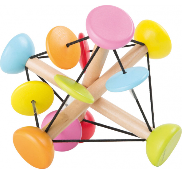 Rozměry: 13x13x13 cm Věk: 1+ Materiál: dřevo, guma Poškozený obal. Nové zboží bez závad. Tři dřevěné tyčky jsou spojeny gumičkami. Jsou vysoce flexibilní a lze je libovolně otáčet. Je to skutečná sportovní výzva pro malé ručičky. Barevné posuvné prvky při pohybu chrastí. Hlavní vlastnosti: barevný designvyrobeno v Německu z kvalitních a zodpovědně získaných materiálů