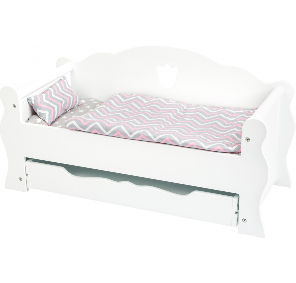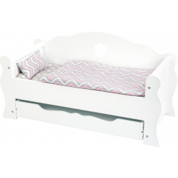 Tuto elegantní postel lze v mžiku proměnit na komfortní pohovku, a tak si najde své využití ve dne i v noci. Do praktického úložného prostoru schováme peřinku a polštář nebo jej využijeme jako místo pro dalšího spáče. Panenky či plyšáci jistě ocení možnost se po náročném dni natáhnout a odpočinout si. Hlavní vlastnosti: vhodné pro panenky do 45 cmpraktický výsuvný úložný prostor pod postelísoučástí matrace, peřinka a polštář