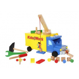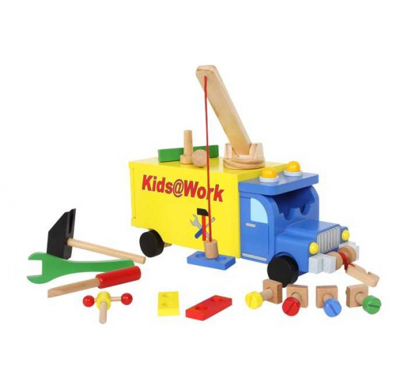Bezvadní nákladní vůz, z kterého bude nadšené každé dítě! Největší překvapení má vůz uvnitř – zde je skrytá zábava pro malé kutily! Ložnou plochu lze o 15 cm vysouvat a slouží pak jako malý pracovní stůl s otvory pro šrouby a hřebíky, kladivo, šroubovák a matice a dokonce malý svěrák. Z dětí se rázem stanou malí řemeslníci! Jeřáb a kladka mají malé magnety, kterými lze zvedat několik z těchto 15 prvků.