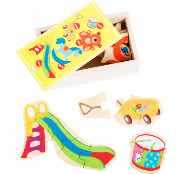 Small Foot Dřevěné puzzle hračky Barevná zábava i pro nejmenší! Puzzle obsahuje pět různých motivů s oblíbenými věcmi dětí – houpací kůň, plyšový medvěd, vozíček, klouzačka a buben jsou připraveny k složení. Puzzle se skládají z dvou až šesti dílků. Dílky jsou vyrobeny z robustního dřeva, jsou krásně malované a jejich velikost je tak akorát pro dětské ruce. Puzzle trénuje jemnou motoriku a můžete jej jednoduše přenášet díky dřevěné krabici. Německá firma Legler zaměřená na výrobu kvalitních dřevěných hraček od roku 1996. Všechny dřevěné hračky značky small foot mají označení CE a jsou vyráběny dle evropské normy pro bezpečnost hraček EN 71. Použité barvy jsou speciálně vyvinuty pro dřevěné hračky a jsou odolné i proti slinám dětí. Dřevo, které se používá pro tyto hračky, většinou pochází z lesnických společností zapojených do zalesňování. To nabízí všem zákazníkům možnost přispět k zachování přirozeně rostoucích lesů. Dřevěné hračky small foot jsou zářivě barevné produkty, které jsou vyrobeny převážně z přírodních surovin - dřeva. Dětem dělají radost od útlého věku, rozvíjí jejich hmatové a smyslové dovednosti. Cílem značky small foot je podporovat duševní a fyzický vývoj dětí.