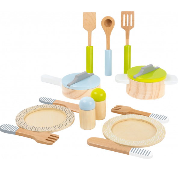Rozměry rendlíků: 8 cm, Ø 9,5 cm Rozměry příborů: 13x3x0,5 cm Věk: 2+ Materiál: dřevo Sada obsahuje 15 ks