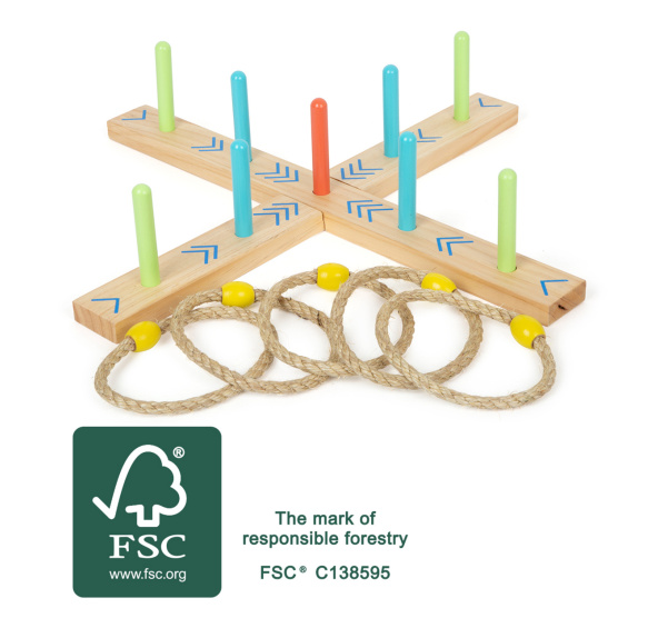 Kdo má nejlepší mušku? V této hře házení krůhu musíte trefit pletené kroužky na 9 kolíků dřevěné základny. Skóre vypočítáte podle barevných šipek, body tak spočítají i děti, které ještě neumí poznávat čísla. Hru lze jednoduše složit a zase rozložit, můžete ji skladovat v bavlněném pytlíku s poutkem, v kterém je od výroby zabalena. Perfektní hra, s kterou si děti užijí mnoho hodin zábavy. Trénuje koordinaci ruka-oko a zručnost. Základna je vyrobena ze 100% certifikovaného FSC® dřeva. Hlavní vlastnosti: házecí hra pro celou rodinu9 kolíků a 5 házecích kruhůpletené kruhy jsou jednoduše uchopitelnébody lze spočítat i bez znalosti číselrychlá montážideální pro procvičování přesnosti hodumoderní design „Active“ Značka a certifikát FSC® (Forest Stewardship Council) zaručuje, že dřevo, ze kterého byl produkt vyroben, nebylo vytěženo nelegálně a pochází z lesů obhospodařovaných šetrným či přírodě blízkým způsobem, ve kterém jsou dodržovány přísné environmentální a sociální požadavky. Značka FSC® na výrobku znamená, že svým nákupem pomáháte chránit lesy a podporujete šetrné, odpovědné či přírodě blízké hospodaření, díky kterému jsou naše lesy stabilnější, zdravější, mají přirozenou druhovou skladbu a lépe odolávají negativním následkům klimatických změn.