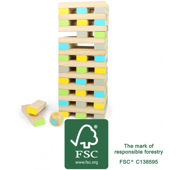 Rozměry dílku: 21x5x3,5 cm Výška věže: 70 cm Možnost stavění věže do výše okolo 100 cm Věk: 3+ Materiál: 100% FSC dřevo Obsahuje 60 dílku a hrací kostku