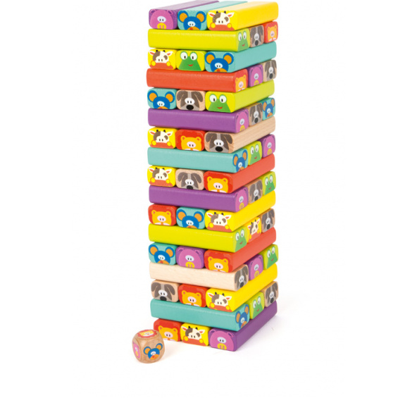 Klasická rodinná hra plná zábavy. Barevné stavební dílky s veselými zvířecími tvářemi inspirují u dětí fantazii a lze je snadno uchopit dětskou rukou. To znamená, že hra podporuje nejen rozvoj motoriky mladých stavitelů, ale také jejich obratnost a soustředění. Hladký povrch dílků umožňuje snadné vytažení z věže, než jsou opatrně položeny na vrchol věže. Ale buďte opatrní. Čím výše se věž dostane, tím bude vratší! Obtížnost hry lze zvýšit tím, že jsou vytahovány dílky s konkrétními zvířecími tvářemi po hození kostky. Dílky mají být položeny po třech na horní část věže a kolmo na řadu bloků níže.Tento proces se opakuje, dokud věž nesejde. Kdo má nejpevnější ruku a má sebevědomí, že vytáhne první blok? Hlavní vlastnosti: Klasická záavná rodinná hraRozvijí motoriku a koncentraci2 obtížnosti hry