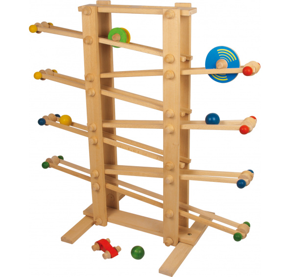Tato velká kuličková dráha, vyrobená z precizně zpracovaného masivního dřeva, přináší pohybovou zábavu! Jasně barevné kuličky, autíčko, točící se disk a sud se zvonečkem uvnitř se kutálejí po dráze se spoustou rachotu! Ať už se kutálejí po dráze jedna za druhou, nebo jednotlivě - prvky jsou radostí pro oči i uši! Dráha je díky svému provedení skladná. Hlavní vlastnosti: zábava s kuličkovou dráhou ve formátu XLstabilní díky stabilním příčkám na základnědobře viditelný podíl dřevěného materiálu