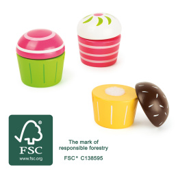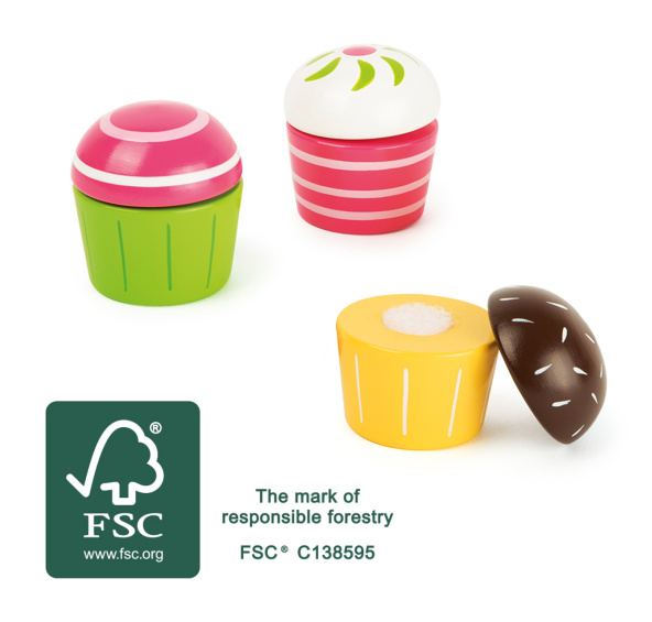 Pozor cukráři! Tyto košíčky vyrobené ze 100% certifikovaného dřeva FSC® lze úžasně kombinovat díky připínání na suchý zip. Jsou skutečným poutačem na prodejním pultu v obchodě! Zde mohou být muffiny podávány a skvěle prezentovány s pestrobarevnou polevou. Tyto lahůdky by neměly chybět v žádném obchodě. Hlavní vlastnosti: rozvíjí jemnou motoriku dětí podporuje komunikační dovednostivyrobeno ze 100% FSC dřeva Značka a certifikát FSC® (Forest Stewardship Council) zaručuje, že dřevo, ze kterého byl produkt vyroben, nebylo vytěženo nelegálně a pochází z lesů obhospodařovaných šetrným či přírodě blízkým způsobem, ve kterém jsou dodržovány přísné environmentální a sociální požadavky. Značka FSC® na výrobku znamená, že svým nákupem pomáháte chránit lesy a podporujete šetrné, odpovědné či přírodě blízké hospodaření, díky kterému jsou naše lesy stabilnější, zdravější, mají přirozenou druhovou skladbu a lépe odolávají negativním následkům klimatických změn.