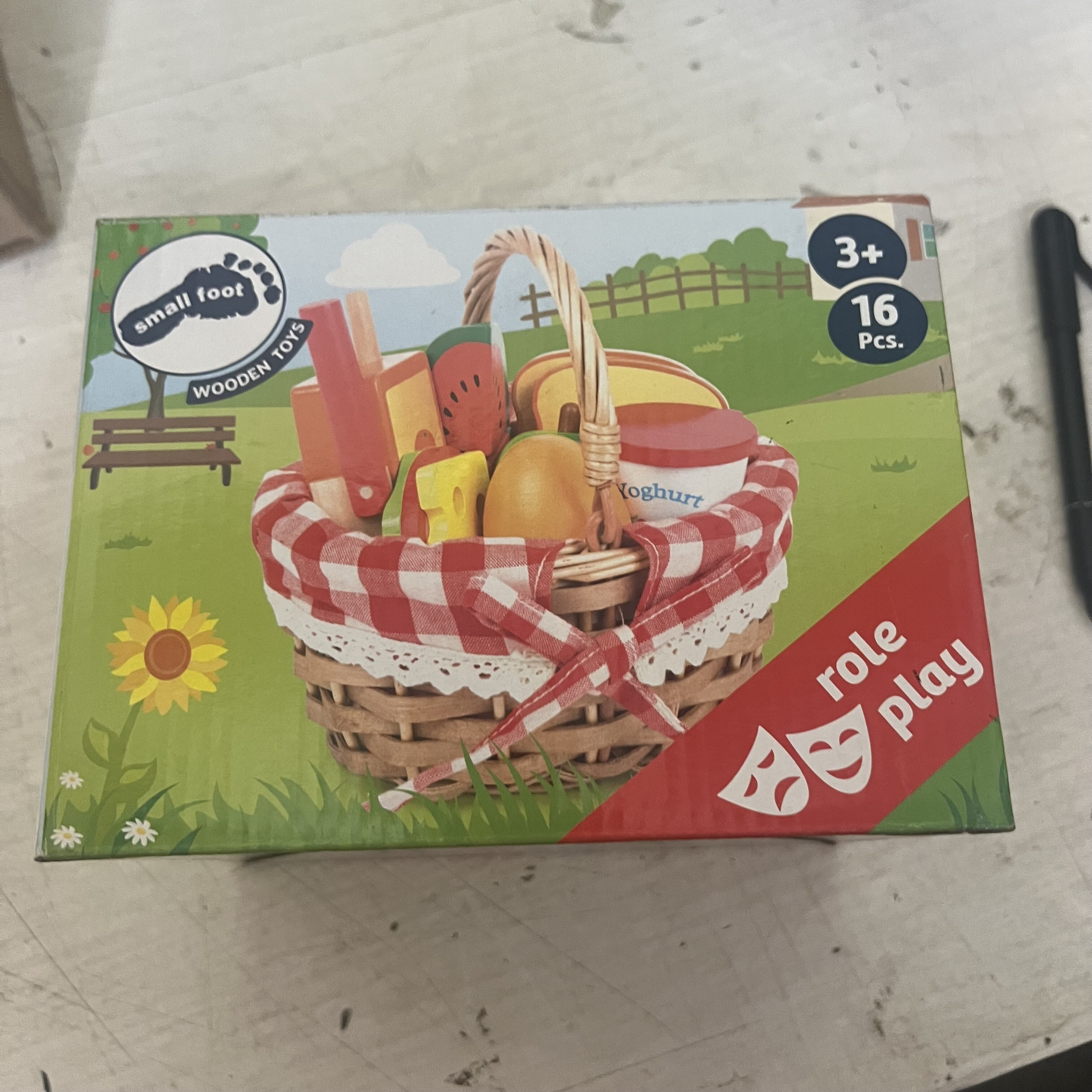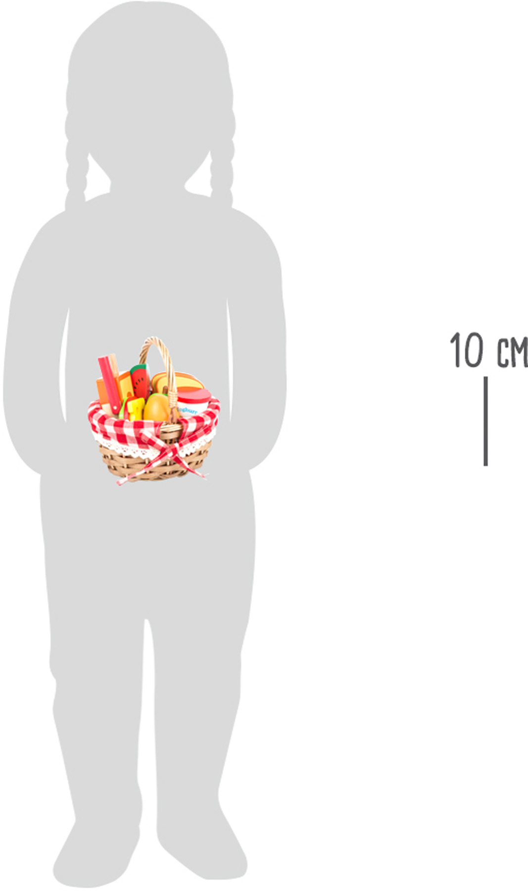 Tkaný piknikový košík je plný čerstvých dřevěných potravin! Tento koš obsahuje dva krajíce chleba, plátek sýra, rajče, list salátu, vejce, kousek melounu, jablko, kelímek jogurtu a balíček s nápojem. Děti se hravou formou naučí zacházet s nožem při „krájení“ potravin, které drží pohromadě pomocí suchého zipu. Nachystáte panenkám chutnou a zdravou svačinku, i když zrovna nejste doma? Hlavní vlastnosti: košík obsahuje 10ks potravin a nůžněkteré potraviny lze „krájet“ (spojené suchým zipem) praktický, přenosný košík.