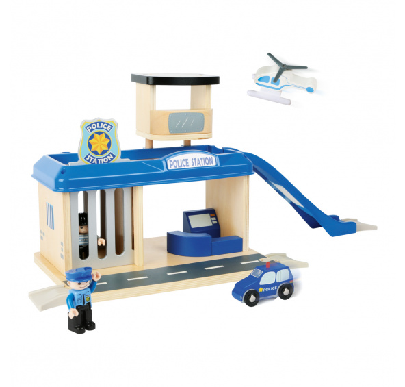 Video je pouze ilustrační, zobrazuje příbuzný produkt. Žádný dareba už neunikne spravedlnosti! S policejní stanicí mohou děti rozehrát fantastická dobrodružství, mezi příslušenstvím je jim totiž k dispozici jak policejní autíčko a vrtulník, tak i pohyblivá figurka policisty a zločince. Stanice nabízí dvě podlaží a věž s heliportem. V přízemí naleznete celu s výsuvnou mříží a v patře lze s využitím nájezdové rampy zaparkovat. Díky kombinaci silné překližky a robustních plastových dílů může hračka nabídnout vysokou odolnost a životnost. Lze ji rozšířit množstvím příslušenství a je také plně kompatibilní s vláčkodráhami jiných velkých výrobců. Hlavní vlastnosti:stanice, 2 díly interiérového vybavení, autíčko, helikoptéra a 2 figurky2 podlaží s věží, rampa a cela s výsuvnou mřížírobustní a odolné provedeníkompatibilní i s vláčkodráhami dalších výrobců