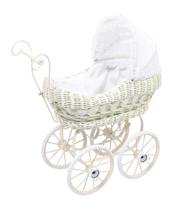 Tento bílý proutěný kočárek na kovovém rámu je současně stylovou hračkou a kouzelnou dekorací. Krásná kola s drátěným výpletem potažená gumou zaručují tichou jízdu. Stříška z jemného textilu zdobena bílou krajkou a drobnými výšivkami se dá sklápět. Výrobek vyžaduje montáž, dodáváno s obrázkovým návodem k sestavení. Hlavní vlastnosti: pogumovaná kola - tichá jízda, sklápěcí stříška a atraktivní provedení z dřevěného proutí.