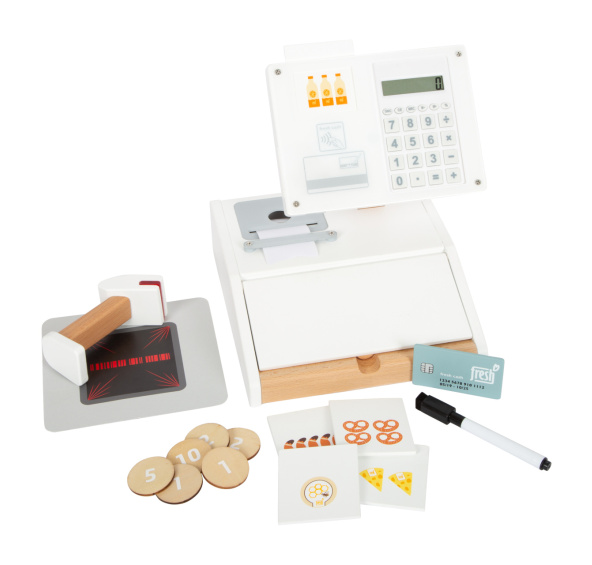 Krásná a moderní pokladna ze dřeva se bude perfektně hodit do dětských prodejních stánků. Má realistické doplňky a zábavné funkce. V balení najdete čtečku čárových kódů, trhací roli účtenek, monitor, skener, debetní kartu, produktové karty, oboustranné dřevěné mince. Dále také fungující kalkulačku, která je integrovaná v monitoru, otevíratelný šuplík pokladny s dvěma přihrádkami, jako v opravdovém supermarketu. Mazatelný fixem se při placení kartou podepište na plexisklo. Baterie nejsou součástí balení.Chcete platit jako ve skutečném supermarketu? Potom je tato pokladna právě pro vás. Zahrajte si na obchod přímo u vás doma, naučíte se používat peníze, zlepšíte se v počtech, při velkých nákupech můžete použít kalkulačku. Vysoce kvalitní pokladna z robustního dřeva potěší všechny malé obchodníky. Hlavní vlastnosti: čtečka čárových kódů, trhací role účtenek, otočný monitor, fungující kalkulačka, platební karta, karty produktů, 15 oboustranných dřevěných mincívelký šuplík pokladny lze otevřítkartičky produktů jsou oboustranné, lze je zasunout do vrchní strany monitorumazatelným fixem se můžete při placení kartou podepisovat na plexiskloděti si při počítání peněz a potravin procvičí matematikukompatibilní s dalšími produkty z řady „Fresh“jednoduchý a moderní nordický design s viditelným dřevem