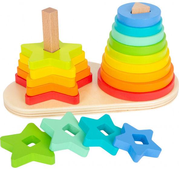 Barevná jako duha! Tato nasazovačka a vkládačka ve tvaru hvězdičky a kolečka nadchne všechni děti! Cílem je dílky seřadit podle tvaru a velikosti ve správném pořadí. Hračka naučí děti rozeznávat tvary, barvy a velikosti, také procvičí jejich motoriku a koordinaci ruka-oko. Nekonečné možnosti nasazování! Kdo dokáže postavit duhu? Hlavní vlastnosti: jasné a výrazné barvyzákladová deska a 18 dílů