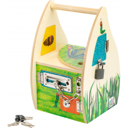 Rozměry: 17x18x28 cm Věk: 3+ Materiál: dřevo Zamkni dům či truhlu s hladovou housenkou! Tento tajemný dům z masivu je opatřen sadou zámků a petlic, které je třeba otevřít. Jemné motorické dovednosti jsou trénovány otevíráním a zavíráním různých mechanismů zámků. Dům lze také použít jako truhlu s přihrádkami a přepážkou! Díky praktické rukojeti nahoře je hra ideální pro přenášení. Různé uzávěry jsou vyrobeny z odolného kovu a tak zajišťují dlouhodobou zábavu!