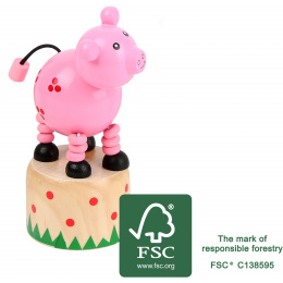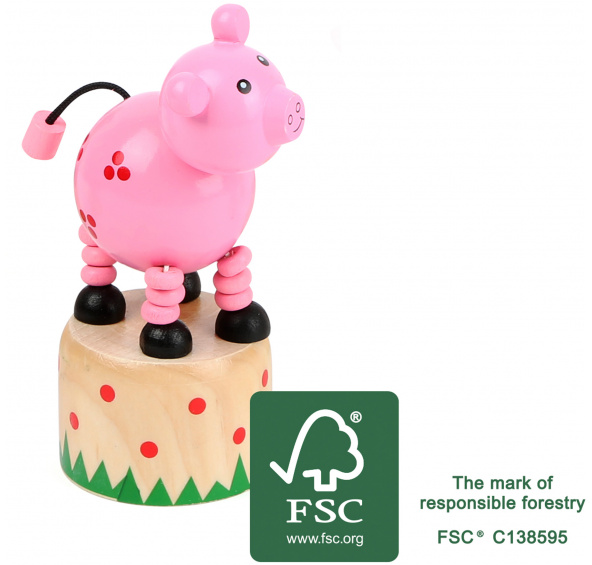 Tady se někdo opravdu hodně kroutí! Zmáčkněte tlačítko vespod podstavce a toto veselé prasátko začne bláznivě tančit. Hračka je vyrobena ze 100% FSC® certifikovaného dřeva. Hlavní vlastnosti: 100% FSC® dřevoprasátko tančí při zmáčknutí tlačítka vespod podstavce Značka a certifikát FSC® (Forest Stewardship Council) zaručuje, že dřevo, ze kterého byl produkt vyroben, nebylo vytěženo nelegálně a pochází z lesů obhospodařovaných šetrným či přírodě blízkým způsobem, ve kterém jsou dodržovány přísné environmentální a sociální požadavky. Značka FSC® na výrobku znamená, že svým nákupem pomáháte chránit lesy a podporujete šetrné, odpovědné či přírodě blízké hospodaření, díky kterému jsou naše lesy stabilnější, zdravější, mají přirozenou druhovou skladbu a lépe odolávají negativním následkům klimatických změn.