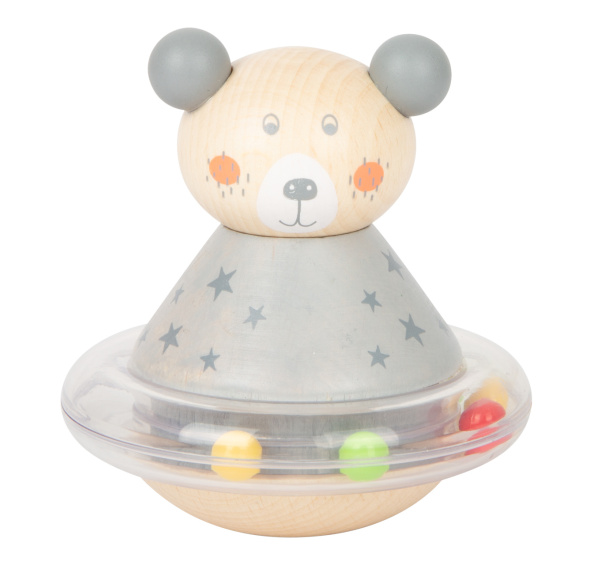 Zvířátko, postav se! Když do roztomilých dřevěných zvířátek strčíte, začnou se houpat dopředu a dozadu, zároveň se perličky kolem jejich pasu začnou pohybovat a vydávat pěkný zvuk. Plastový kroužek s perličkami je otočný, hlava zvířat je připevněna gumičkou. Medvěd, králík a slon jsou zároveň hmatací hračkou i chrastítkem.