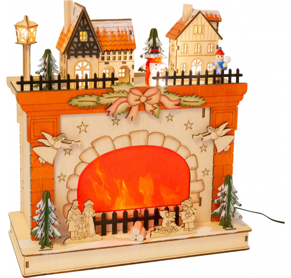 Rozměry: 30x13x32 cm Materiál: dřevo Napájení: USB Dekorativní osvětlení pro chladné zimní dny. Tato lampa zaujme zákazníky vizuálním ohništěm v jemných červených tónech a podrobnými vánočními ozdobami vyrobenými z kvalitně vyrobeného dřeva. Díky tomu oheň a malá zimní vesnice na horní straně svítí teplým světlem. Elektronické osvětlení je napájeno přes port USB. Hlavní vlastnosti: elektronické osvětlení je napájeno přes port USBvytváří kouzelnou adventní atmosférupropracované detaily