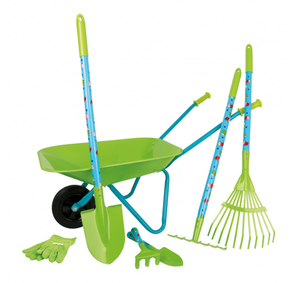 Hurá na zahradu! Mladí zahradkáři Vám rádi pomohou s touto velkou sadou zahradního nářadí. Stačí si nasadit rukavice a mohou začít motykou, hráběmi, rýčem, kolečkem a dalšími nástroji pomáhat a rozvíjet své zahradnické zkušenosti. Všechny díly jsou vyrobeny z vysoce kvalitního, jemně opracovaného kovu a díky svému dětskému designu a jarním barvám potěší každého malého zahrádkáře. Hlavní vlastnosti: součástí balení je vše dle obrázkuideální velikost pro dětirozvíjí motoriku, rovnováhu a vztah k příroděvyrobeno z kvalitních materiálů kovu a dřevakolečko má plastové kolo s pevnou bezvzduchovou gumovou pneumatikou