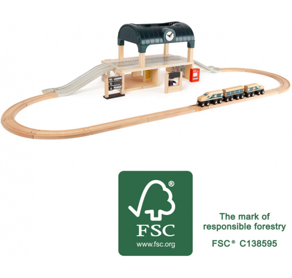 Ukončete nástup, dveře se zavírají. Dvoupatrové vlakové nádraží je vyrobeno ze 100% FSC dřeva, má mnoho doplňků jako obchod, automat na lístky, zobrazovací displej s destinacemi (na který můžete psát), hodiny. V balení samozřejmě i vlak. Nádraží je jako opravdové! Díky otevřené střeše je zde mnoho místa pro hru. Další skvělá věc, díky hlubšímu profilu kolejnic na nich mohou jezdit i vlaky na baterky (není součástí balení). S touto hračkou se každý dětský pokoj promění ve velkoměstskou vlakovou stanici! Hlavní vlastnosti: 100% FSC dřevostanice s mnoha detaily a funkčními prvky Značka a certifikát FSC® (Forest Stewardship Council) zaručuje, že dřevo, ze kterého byl produkt vyroben, nebylo vytěženo nelegálně a pochází z lesů obhospodařovaných šetrným či přírodě blízkým způsobem, ve kterém jsou dodržovány přísné environmentální a sociální požadavky. Značka FSC® na výrobku znamená, že svým nákupem pomáháte chránit lesy a podporujete šetrné, odpovědné či přírodě blízké hospodaření, díky kterému jsou naše lesy stabilnější, zdravější, mají přirozenou druhovou skladbu a lépe odolávají negativním následkům klimatických změn.