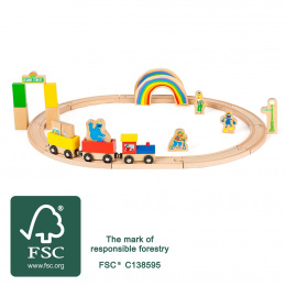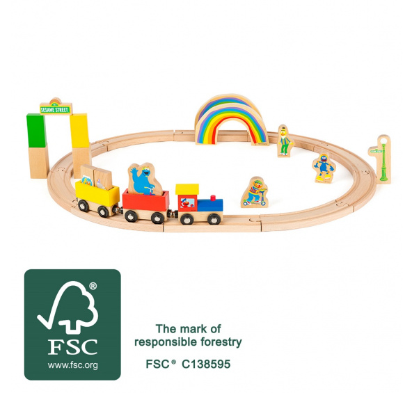 Výlet může začít! Ernie a ostatní oblíbené postavy z pohádky Sezame, otevři se jezdí dokolečka v dřevěném vláčku! Tato herní sada se skládá z 27 dílků, které jsou částečně lakované a ze 100% FSC® dřeva. Hračku budou milovat nejen vlakoví nadšenci. Roztomilé a barevné motivy, velké a robustní dílky, to vše přispívá ke hře plné nadšení a zábavy. Jednoduše složte koleje, položte tunel, osvětlení. Elmo může vyzvednout své přátele, kteří se posadí do dvou magnetických vagónků. Tato vláčkodráha Sezame, otevři se je kompatibilní s ostatními vláčkodráhami a bude se perfektně hodit do každého dětského pokoje. Hlavní vlastnosti: 100% FSC® dřevoBarevné a přírodní dřevoKompatibilní s ostatními vláčkodráhami   Značka a certifikát FSC® (Forest Stewardship Council) zaručuje, že dřevo, ze kterého byl produkt vyroben, nebylo vytěženo nelegálně a pochází z lesů obhospodařovaných šetrným či přírodě blízkým způsobem, ve kterém jsou dodržovány přísné environmentální a sociální požadavky. Značka FSC® na výrobku znamená, že svým nákupem pomáháte chránit lesy a podporujete šetrné, odpovědné či přírodě blízké hospodaření, díky kterému jsou naše lesy stabilnější, zdravější, mají přirozenou druhovou skladbu a lépe odolávají negativním následkům klimatických změn.