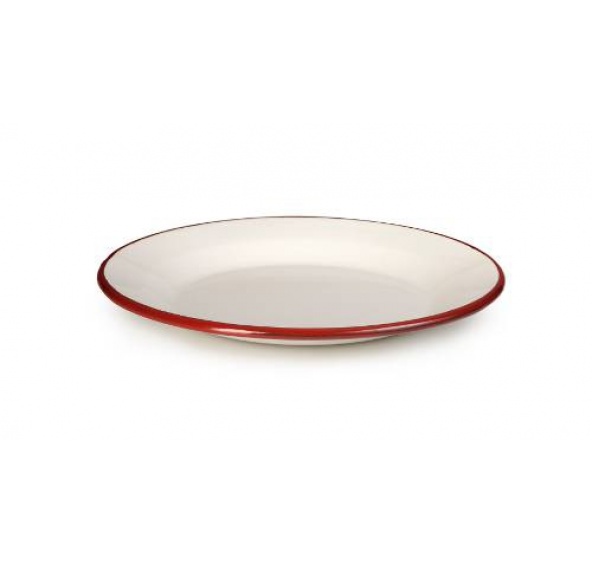 Talířek bílé barvy s červeným okrajem o průměru 22 cm. Talířek lze použít jako jídelní talíř i talíř servírovací. Je vyrobený z kovu s kvalitním smaltovaným povrchem. Talířek můžete mýt v myčce.